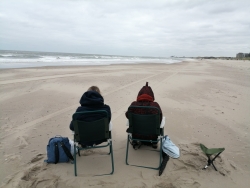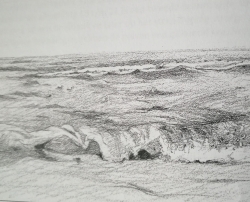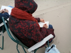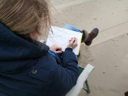 Heerlijk op het strand tekenen met voeten in het warme zand. Dichtbij de zee, waar je goed de golfslag kan zien, de schelpen en het sporen van eb en vloed, voetstappen en voertuigen. Of dichtbij het havenhoofd, waar de formatie van rotsblokken een mooie compositie geven, de surfers en nog veel meer. En een wijds gezicht op de horizon, de luchten die nooit hetzelfde zijn en de vogels op het strand, in het water of in de lucht. Keuzes genoeg!